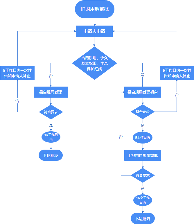 1、申請人向臨時用地所在地的縣(市、區)自然資源主管部門提出申請,由縣(市、區)自然資源主管部門負責辦理臨時用地審批。