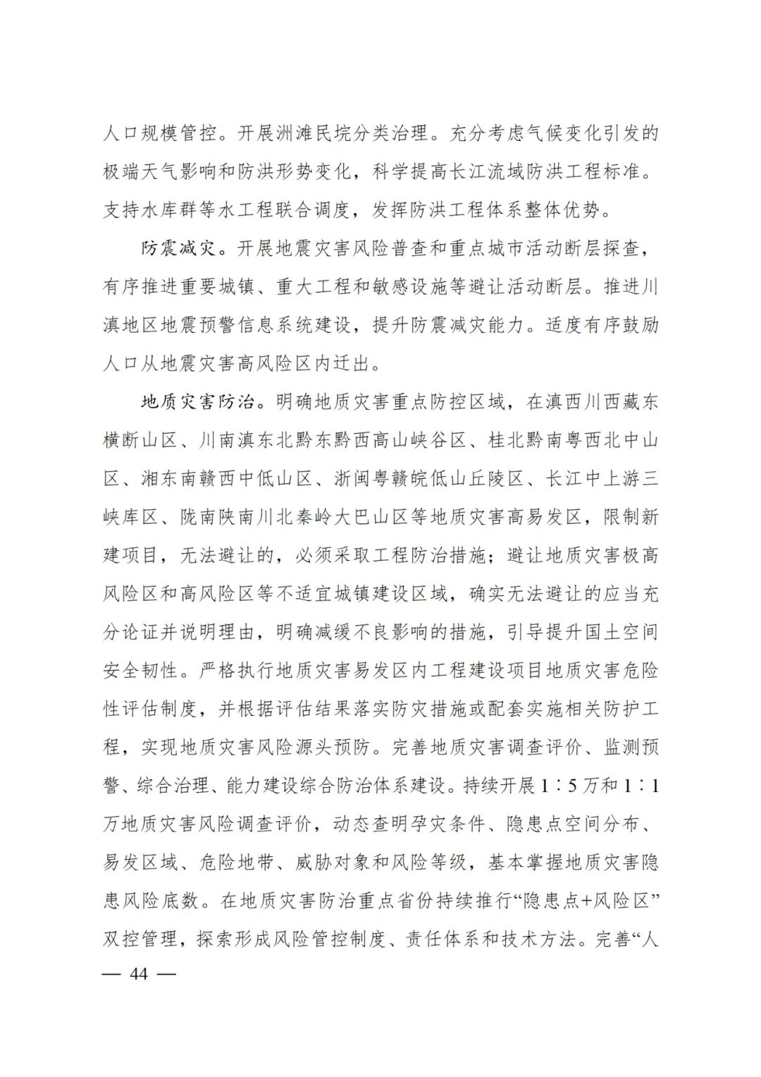 地質(zhì)災(zāi)害防治 明確地質(zhì)災(zāi)害重點(diǎn)防控區(qū)域,在滇西川西藏東橫斷山區(qū)、川南滇東北黔東黔西高山峽谷區(qū)、桂北黔南粵西北中山區(qū)、湘東南贛西中低山區(qū)、浙閩粵贛皖低山丘陵區(qū)、長江中上游三峽庫區(qū)、隴南陜南川北秦嶺大巴山區(qū)等地質(zhì)災(zāi)害高易發(fā)區(qū),限制新建項(xiàng)目,無法避讓的,必須采取工程防治措施;避讓地質(zhì)災(zāi)害極高風(fēng)險區(qū)和高風(fēng)險區(qū)等不適宜城鎮(zhèn)建設(shè)區(qū)域,確實(shí)無法避讓的應(yīng)當(dāng)充分論證并說明理由,明確減緩不良影響的措施,引導(dǎo)提升國土空間安全韌性。