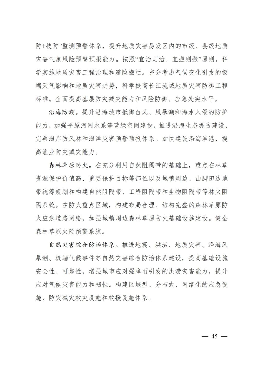 推進(jìn)地震、洪澇、地質(zhì)災(zāi)害、沿海風(fēng)暴潮、極端氣候事件等自然災(zāi)害綜合防治體系建設(shè),提高基礎(chǔ)設(shè)施安全性、可靠性,增強(qiáng)城市應(yīng)對強(qiáng)降雨引發(fā)的洪澇災(zāi)害能力,提升應(yīng)對氣候?yàn)?zāi)害能力和韌性。構(gòu)建區(qū)域型、分布式、網(wǎng)絡(luò)化的應(yīng)急設(shè)施、防災(zāi)減災(zāi)救災(zāi)設(shè)施和救援設(shè)施體系。