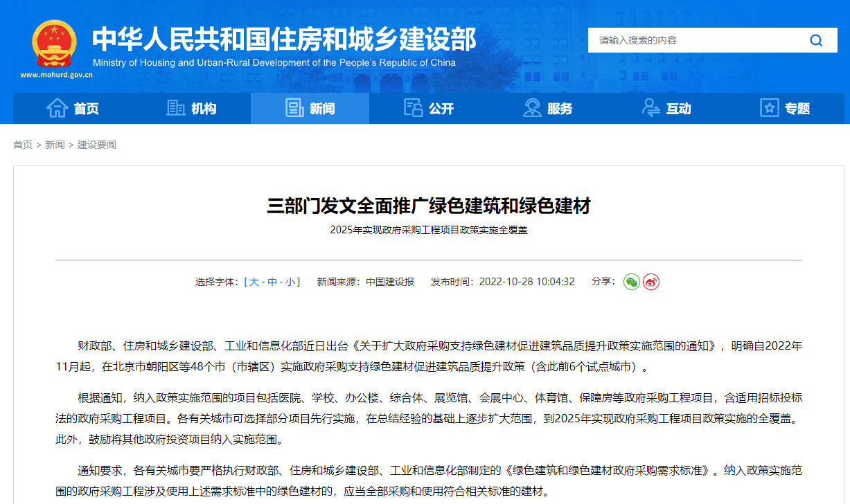 財政部、住房和城鄉建設部、工業和信息化部近日出臺《關于擴大政府采購支持綠色建材促進建筑品質提升政策實施范圍的通知》,明確自2022年11月起,在北京市朝陽區等48個市(市轄區)實施政府采購支持綠色建材促進建筑品質提升政策(含此前6個試點城市)。根據通知,納入政策實施范圍的項目包括醫院、學校、辦公樓、綜合體、展覽館、會展中心、體育館、保障房等政府采購工程項目,含適用招標投標法的政府采購工程項目。各有關城市可選擇部分項目先行實施,在總結經驗的基礎上逐步擴大范圍,到2025年實現政府采購工程項目政策實施的全覆蓋。