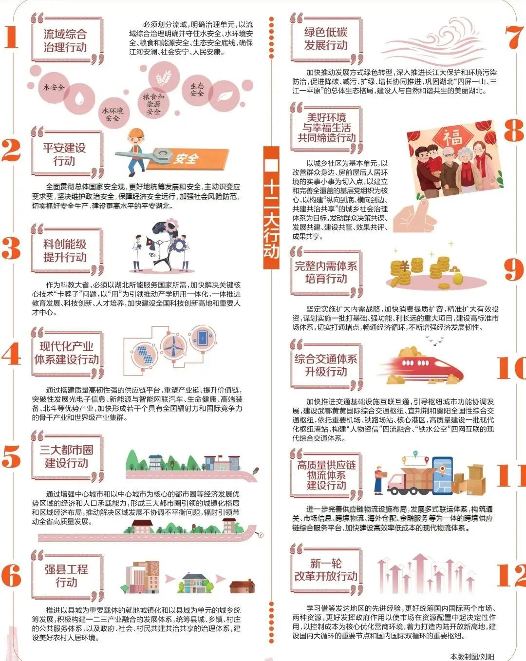 4月18日,湖北省政府新聞辦召開(kāi)《關(guān)于加快建設(shè)全國(guó)構(gòu)建新發(fā)展格局先行區(qū)的實(shí)施意見(jiàn)》(以下簡(jiǎn)稱《實(shí)施意見(jiàn)》)精神解讀系列新聞發(fā)布會(huì)第一場(chǎng)?!秾?shí)施意見(jiàn)》共分三大部分和附件。第一部分是總體要求,主要闡述文件起草的指導(dǎo)思想、總體思路、基本原則、主要目標(biāo);第二部分是主體,圍繞統(tǒng)籌發(fā)展和安全、統(tǒng)籌城鄉(xiāng)區(qū)域和資源環(huán)境、統(tǒng)籌國(guó)內(nèi)國(guó)際兩個(gè)市場(chǎng)兩種資源,部署“十二大行動(dòng)”(具體內(nèi)容見(jiàn)下圖);第三部分從組織領(lǐng)導(dǎo)、完善配套政策、加強(qiáng)考核評(píng)估等方面強(qiáng)調(diào)了推進(jìn)實(shí)施的保障措施。附件為加快建設(shè)全國(guó)構(gòu)建新發(fā)展格局先行區(qū)的主要指標(biāo),設(shè)定了71項(xiàng)數(shù)據(jù)指標(biāo)。