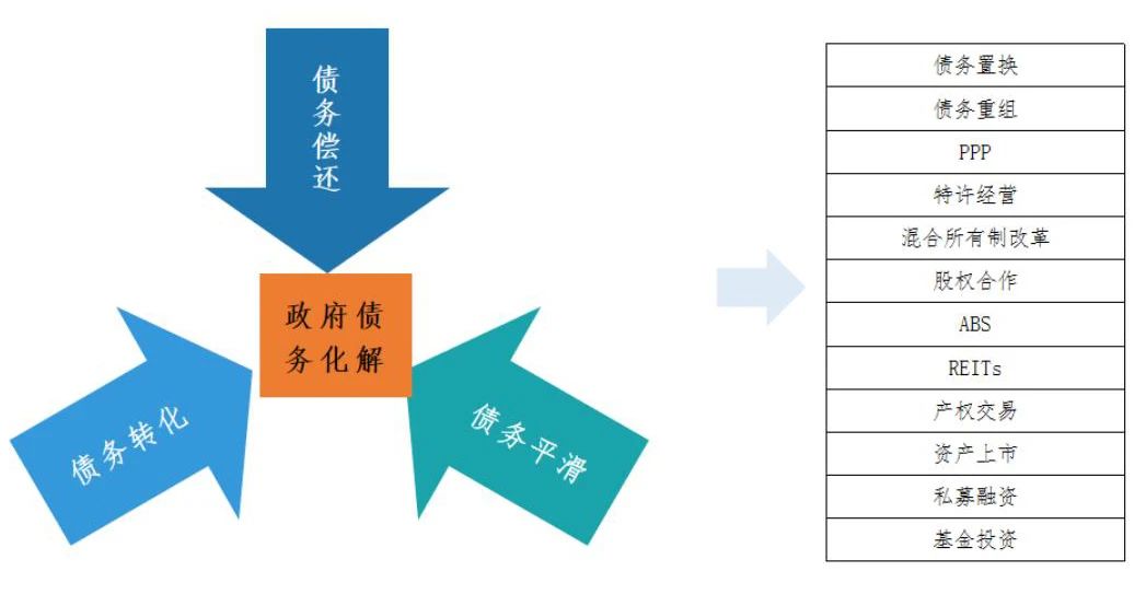結合國家相關政策、學術理論以及實踐經驗,我們提出了圍繞“債務平滑、債務轉化、債務償還”三大策略方向,主要運用“債務置換、債務重組、PPP、特許經營、混合所有制改革、股權合作、ABS、REITs、產權交易、資產上市、私募融資、基金投資”十二種工具,建立明確的債務化解規劃,制定分年度債務化解目標,切實有效實現政府隱性債的化解,促進地方政府投融資運作健康可持續。