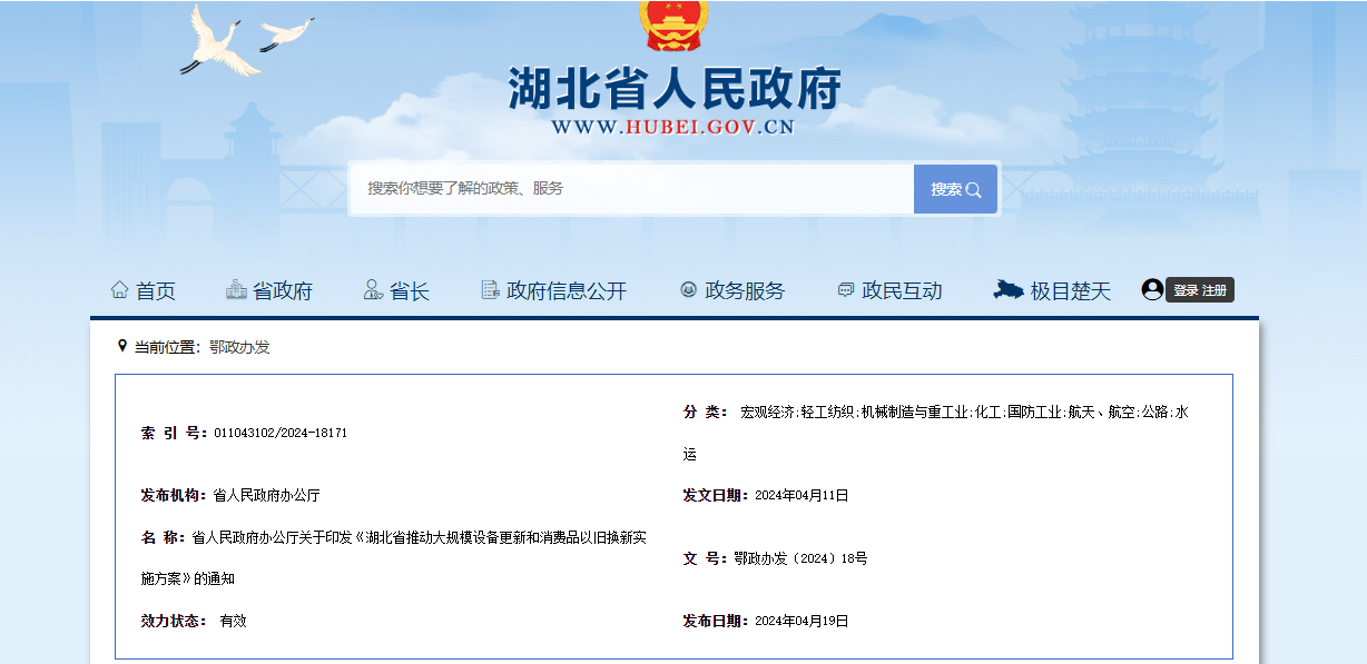 4月19日,湖北省人民政府網(wǎng)發(fā)布省人民政府辦公廳關(guān)于印發(fā)《湖北省推動(dòng)大規(guī)模設(shè)備更新和消費(fèi)品以舊換新實(shí)施方案》的通知。