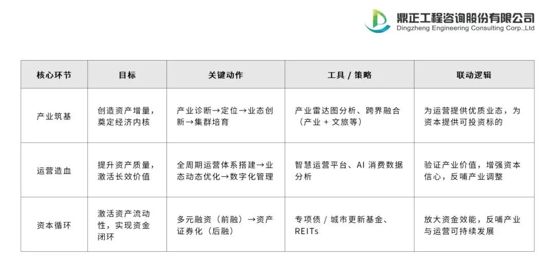 城市更新的本質是“產業價值發現 — 運營價值提升 — 資本價值實現”的過程。通過產業精準定位創造資產增量,運營精細化管理提升資產質量,資本工具創新激活資產流動性,最終形成“產業筑基 — 運營造血 — 資本循環”的可持續生態,推動城市從“空間更新”邁向“價值再生”。