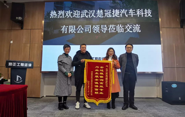 2020年1月14日,武漢楚冠捷汽車科技有限公司龔經理、朱主任蒞臨鼎正咨詢公司,特向為其二期廠房建設項目提供全過程工程咨詢服務的鼎正咨詢團隊及項目負責人程正一贈送錦旗并表達感謝