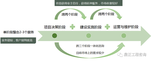 跨階段全過(guò)程程咨詢(xún)指提供跨兩個(gè)階段的服務(wù),能實(shí)現(xiàn)項(xiàng)目管理+2項(xiàng)以上專(zhuān)業(yè)咨詢(xún)服務(wù),容易獲得業(yè)主信任,獲得延伸服務(wù),市場(chǎng)前景較好。